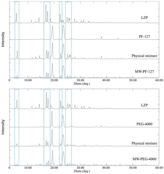 PXRD patterns of LZP, PF-127, PEG 4000, physical mixtures, and the prepared solid dispersion formulations using the microwave method. The Figure employs blue rectangles to visually designate the locations of LNS characteristic peaks of interest.