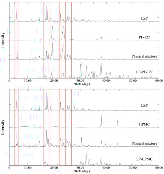 PXRD patterns of LZP, PF-127, HPMC, physical mixtures, and the prepared solid dispersion formulations using the lyophilization method. The Figure employs red rectangles to visually designate the locations of LNS characteristic peaks of interest.
