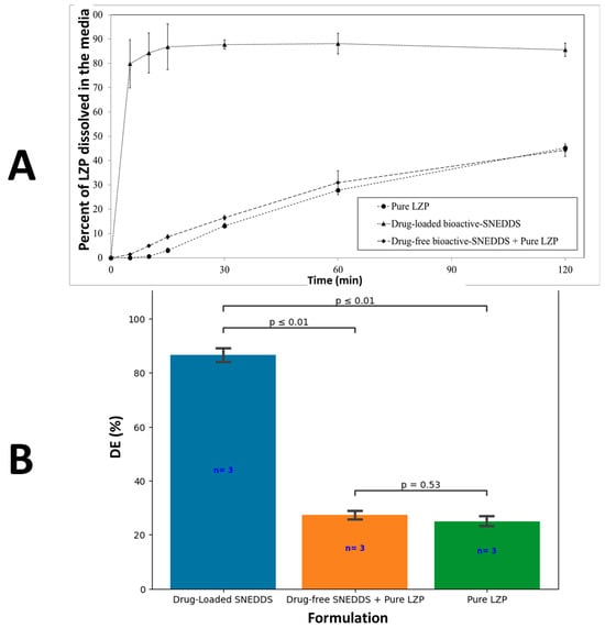 (A) In vitro dissolution profile of pure LZP, drug-loaded bioactive SNEDDS, and drug-free bioactive SNEDDS + pure LZP. (B) Graphical representation of DE of corresponding formulations.