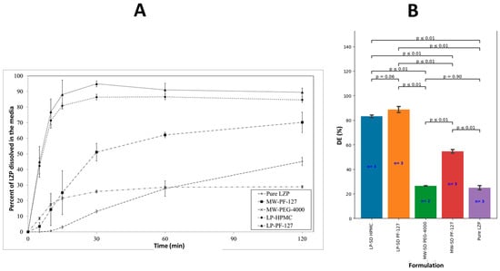 (A) In vitro dissolution profile of pure LZP and the prepared SD formulations. (B) Graphical representation of DE of corresponding formulations.