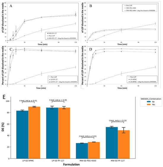In vitro dissolution profile of pure LZP, SD formulation, and SD formulation + drug-free bioactive SNEDDS (A) MW-PF-127, (B) MW-PEG-4000, (C) LP-PF-127, (D) LP-HPMC and (E) Graphical representation of DE of corresponding formulations.
