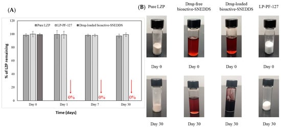 The (A) chemical and (B) physical stability study of pure LZP, LP-PF-127, and drug-loaded bioactive SNEDDS under accelerated storage conditions for 1 month (left).