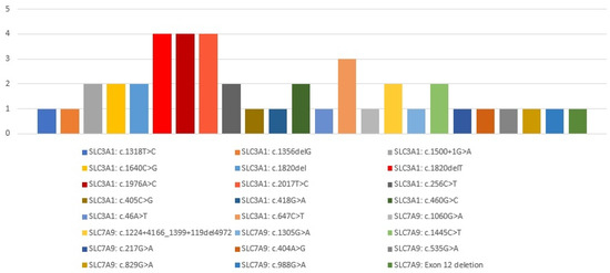- Chatzikyriakidou, A.; Louizou, E.; Dedousis, G.V.; Bisceglia, L.; Michelakakis, H.; Georgiou, I. An overview of SLC3A1 and SLC7A9 mutations in Greek cystinuria patients. Mol. Genet. Metab. 2008, 95, 192–193. [Google Scholar] [CrossRef]