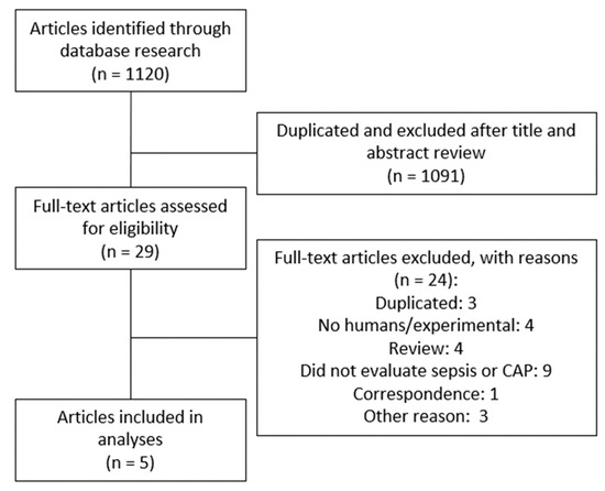 Figure 1 shows the PRISMA flowchart describing the process of the systematic literature search to identify all eligible studies. We identified and screened 1120 papers. A total of 1091 articles were excluded because they did not meet the inclusion criteria based on title and abstract or duplication. Therefore, 29 articles were considered relevant for full-text review and eligibility, of which five were included in this systematic review [24,27,28,29,30].