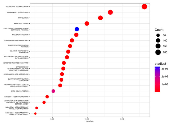 Moreover, 88 pathways in the Reactome database were identified with DEGs and small RNAs. The top enriched Reactome pathways were annotated as related to translation, neutrophil degranulation, influenza infection, rRNA processing, SRP-dependent cotranslational protein targeting to the membrane, nonsense-mediated decay (NMD), response of EIF2AK4 (GCN2) to amino acid deficiency, selenoamino acid metabolism, and others (Table 3 and Figure 4 and Figure 5).
