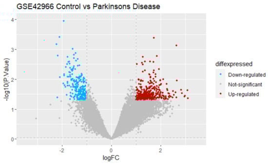 The microarray dataset GSE42966 from the Gene Expression Omnibus (GEO) database was collected using the GPL4133 platform (Agilent-014850 Whole Human Genome Microarray 4 × 44 K G4112F) and was downloaded for research purposes [19,20]. This dataset focused on comparing the gene expressions in Parkinson’s disease and normal brain tissue from the substantia nigra region. The aim of the study was to identify the differentially expressed genes (DEGs) in the PD brain, which aligns with the scope of our research. The analysis of differentially expressed genes was conducted using the GEO2R online tool (https://www.ncbi.nlm.nih.gov/geo/geo2r/, accessed on 20 July 2023). Genes with a p-value of less than 0.05 and a logarithmic fold change of at least 1.0 were considered to be upregulated, while genes with a p-value of less than 0.05 and a logarithmic fold change of less than −1.0 were considered to be downregulated. The results of this analysis are shown in the form of volcano plots. The expression values of the DEGs were obtained using the GEO2R online tool.