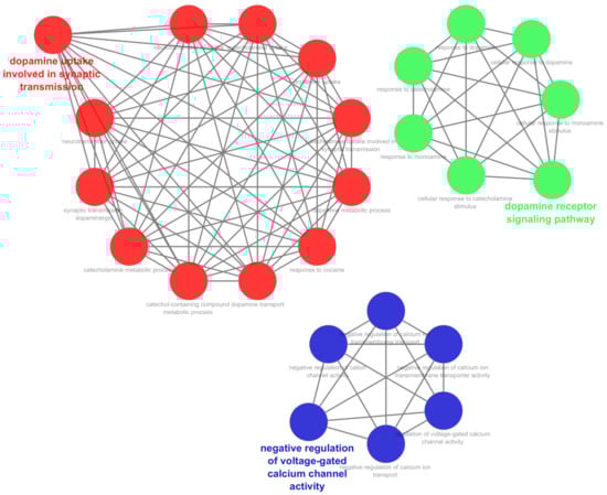 A KEGG pathway enrichment analysis was carried out (Figure 5), and all the pathways with a p-value of less than 0.05 were screened and ranked based on their p-value. The KEGG pathways primarily involved were those related to dopaminergic synapses, alcoholism, GABAergic synapses, morphine addiction, and circadian entrainment. Additionally, a ClueGo cluster analysis revealed that the KEGG-enriched pathways were primarily involved in dopamine uptake regulation for synaptic transmission, the dopamine receptor signaling pathway (Figure 5), and the negative regulation of voltage-gated calcium channel activity.