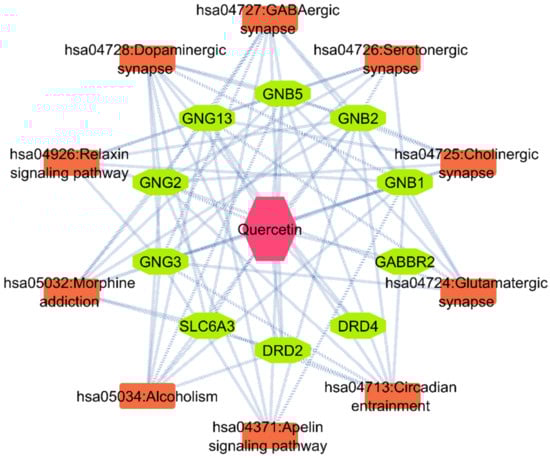 Component–target–pathway network of QUE in Parkinson’s disease. Pink represents Quercetin, green represents the targets, and orange represents the pathway.