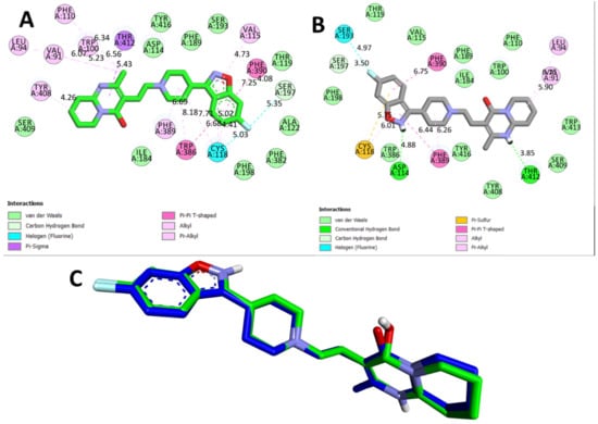 Different 2D bonding interactions between 6m4 and the native risperidone inhibitor. (A) Co-crystallized pose, (B) redocked pose, and (C) validation of the docking algorithm by redocking the native. Inhibitor risperidone on the target Dopamine D2 receptor (PDB ID:6CM4). Green: native crystallized pose of Risperidone; and blue: docked pose of risperidone.