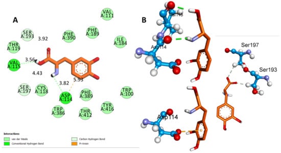 Depictions of the interactions between l-DOPA and the D2 receptor. (A) Two-dimensional interactions of l-DOPA with the D2 receptor (PDB ID:6CM4). (B)The 2D representation illustrates the interactions between l-DOPA and the D2 receptor (PDB ID:6CM4) via the hydrogen bond formed with Val 115, hydrophobic interactions with Ser 197 and Ser 193, and electrostatic interactions with Asp 114.