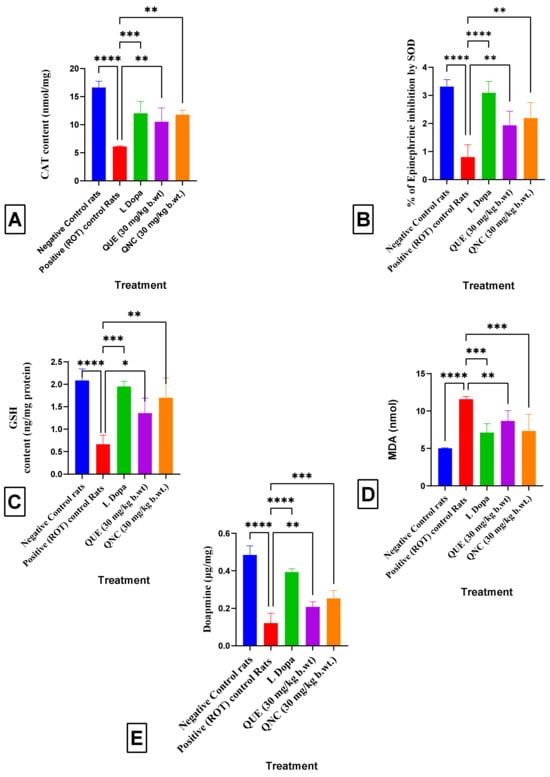 Several investigations have shown that oxidative stress plays a crucial role in degenerating dopaminergic neurons [69]. The results of these studies indicated that rotenone administration led to increased oxidative damage in the rat brain, characterized by the decreased activity of antioxidant enzymes such as SOD, GSH, and CAT, along with elevated levels of MDA. These findings are consistent with those of a previous study conducted by Altharawi et al. [33]. Interestingly, pretreatment with QNC resulted in a significant decrease in MDA and an increase in the brain catalase, GSH, and SOD contents, similar to that observed in the L-Dopa group when compared to the QUE group.