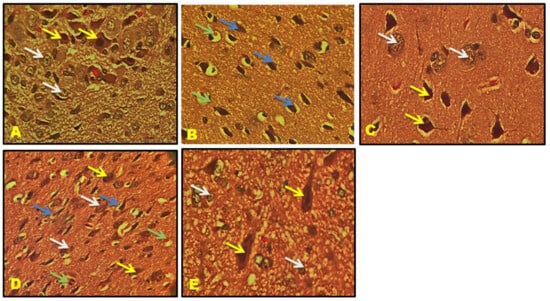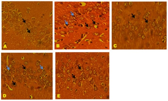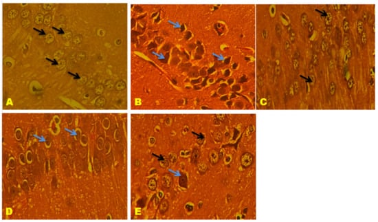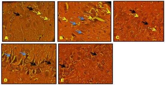 After confirming death by lack of pulse, breathing, corneal reflex, response to firm toe pinch, and heartbeat using a stethoscope, we decapitated and harvested the brain tissues from the rats that were ether anesthetized, and then placed them in 10% formaldehyde for 2 h. The brains were then removed and placed in a new formaldehyde solution for 24 h before being dehydrated in ethanol (70, 90, and 100%) for 24 h. The specimens were then cleaned in xylene and embedded in paraffin. Coronal slices were cut from the brains at a thickness of 5 µm using a Leica RM 2025 microtome, mounted on glass slides, and stained with hematoxylin and eosin [47]. We used Labomed, Inc.’s (Los Angeles, CA, USA) LB-208 Fluorescent Biological Binocular Microscope with an Achromatic Objective to capture the slides and perform morphometric research.