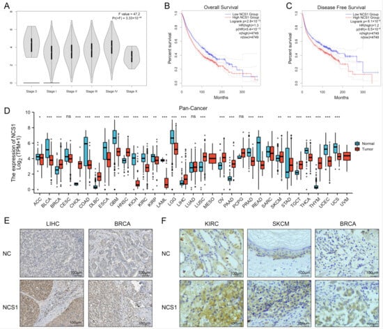 The landscape of NCS1 status in pan-cancer. (A) The correlation between NCS1 expression and the pathological stage of cancer using “pathological stage staging” of GEPIA2.0 found that NCS1 was significantly correlated with the pathological stage of tumors in pan-cancer. (B,C) The Kaplan–Meier plotter database was used to analyze the survival curves of high and low NCS1 expression in 33 human cancer types and determined that NCS1 was associated with lower levels of OS and DFS. (D) The combined data of TCGA and GTEx show the difference in the NCS1 expression in tumor and normal tissues of 33 cancers. * p < 0.05, ** p < 0.01, *** p < 0.001. (E) Representative IHC images of NCS1 expression in normal liver tissue, breast tissue, and LIHC, BRCA tissue from HPA immunohistochemistry data. (F) Representative IHC of NCS1 expression in normal kidney, skin, and breast tissues with corresponding KIRC, SKCM, and BRCA tissues obtained according to TMA MTU1021 images. Abbreviation: ACC: Adrenocortical Cancer; BLCA: Bladder Cancer; BRCA: Breast Cancer; CESC: Cervical Cancer; CHOL: Bile Duct Cancer; COAD: Colon Cancer; DLBC: Large B-cell Lymphoma; ESCA: Esophageal Cancer; GBM: Glioblastoma; HNSC: Head and Neck Cancer; KICH: Kidney Chromophobe; KIRC: Kidney Clear Cell Carcinoma; KIRP: Kidney Papillary Cell Carcinoma; LAML: Acute Myeloid Leukemia; LGG: Lower Grade Glioma; LIHC: Liver Cancer; LUAD: Lung Adenocarcinoma; LUSC: Lung Squamous Cell Carcinoma; MESO: Mesothelioma; OV: Ovarian Cancer; PAAD: Pancreatic Cancer; PCPG: Pheochromocytoma & Paraganglioma; PRAD: Prostate Cancer; READ: Rectal Cancer; SARC: Sarcoma; SKCM: Melanoma; STAD: Stomach Cancer; TGCT: Testicular Cancer; THCA: Thyroid Cancer; THYM: Thymoma; UCEC: Endometrioid Cancer; UCS: Uterine Carcinosarcoma; UVM: Ocular melanomas.