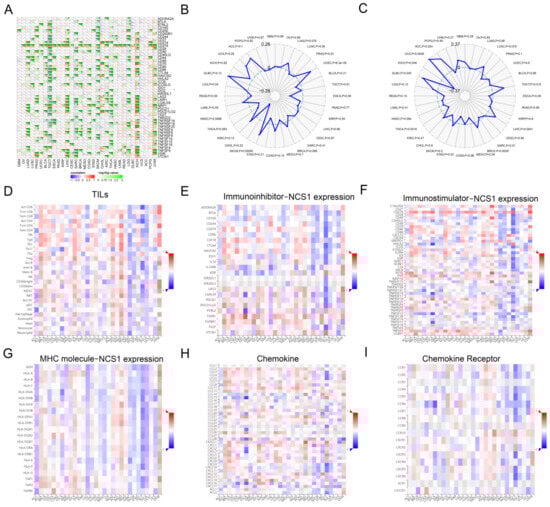 The impact of NCS1 on the tumor microenvironment (TME) immune mechanisms and immune response was investigated by analyzing the correlation between NCS1 expression and tumor mutation burden (TMB) as well as microsatellite instability (MSI) []. Tumor mutation burden (TMB) is a measure that quantifies the number of mutations present in cancer cells [,,]. The researchers calculated the tumor mutation burden (TMB) for each tumor sample and examined its association with NCS1 using Spearman’s rank correlation coefficient. The results indicated a positive correlation between NCS1 expression and TMB in UCEC and SKCM (Figure 3B). Microsatellites (MS) are short sequences of repeated DNA in the human genome that play an important role in tumor development. Microsatellite instability (MSI) is considered a molecular marker for prognosis of colorectal cancer. NCS1 was positively correlated with microsatellite instability in BRCA, DLBC, UCS, ACC (Adrenocortical Cancer), LUSC, TGCT, and LIHC (Figure 3C) and negatively correlated with expression in KICH, THCA, and STAD (Figure 3C). The researchers visualized and scored immunophenotypes, including tumor-infiltrating lymphocytes (TILs) (Figure 3D), immune-inhibitors (Figure 3E), immune-stimulators (Figure 3F), MHC molecules (Figure 3G), chemokines (Figure 3H), and chemokine receptors (Figure 3I). A genetic screening technique based on the ICSDB database was used to investigate whether the NCS1 gene could increase T cell-mediated sensitivity and tumor cell resistance by interacting with 28 types of TILs. According to the multivariate analysis, the NCS1 immunophenotype scores varied among different tumors.