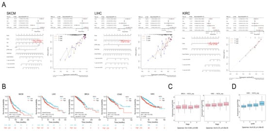 Relationships between NCS1 and prognosis. (A) Univariate and multifactorial regression analyses suggested that NCS1 could be a prognostic predictor for SKCM, LIHC, and KIRC. Patients with different NCS1 expression levels showed significant differences in 1-, 3-, and 5-year survival rates; (B) KM curves of overall survival of NSC1 in SKCM, LIHC, BRCA, COAD, and KIRC. (C) Correlation of NCS1 with pathological stage staging in BRCA and KIRC patients. (D) Correlation between NCS1 and tumor grade in KIRC patients.
