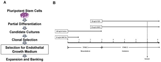 As described above and in Figure 1 [], hESCs were differentiated to promote mesoendoderm/endoderm commitment in the presence of specific growth factors for specific periods of time to obtain the desired endothelial progenitor characteristics. Briefly, after reaching confluence, hESCs were exposed to: (day 0), basal differentiation medium supplemented with 25 ng/mL WNT3A (removed at day 1); and 100 ng/mL activin A (removed at day 3); on day 3, medium was supplemented with 30 ng/mL FGF-4 and 20 ng/mL BMP-2 (remained for the duration of culture). On day 7, the differentiated cells were divided into two growth media as: (1) Microvascular endothelial growth medium (EGM-MV2, Cat# C-39226, PromoCell, GmbH, Heidelberg, Germany) with added (TGF) β -inhibitory molecule SB431542 (10 μM) and (2) Smooth Muscle Growth Medium (SM2) (PromoCell, Cat# C22062) with added SB431542 (10 μM). After further expansion in the two growth media, the cells were seeded at clonal dilution for two weeks. Individual clonal colonies were then selected and placed in a 24-well plate (each clonal colony/well given an independent name) and scaled to multiple T225 flasks before they were frozen down and later thawed for further analysis as described in West et al. [] (Figure 1B and Supplementary Table S1). Throughout the expansion and analysis of eEPCs, cells were continually maintained in the presence of SB431542 in their original growth medium that they were exposed to after the 7 days differentiation procedure.