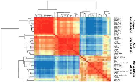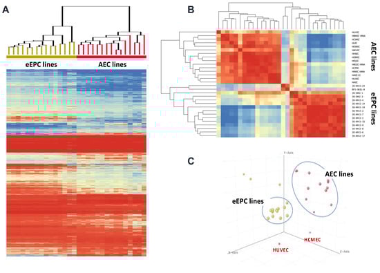 Pearson correlation analysis of 14 human embryonic endothelial progenitor lines (eEPC), 15 adult endothelial cell (AEC) lines and 17 non-endothelial cell lines. Color ranged as high expression (red) to low expression (blue), p (Corr) cut-off = 0.05.