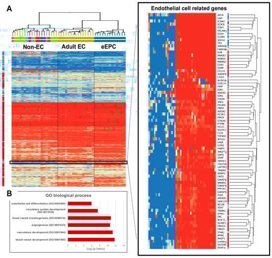 Comparision of endothelial characteristics of 14 clonal eEPC lines to 15 human adult endothelial cell (AEC) lines and 17 non-endothelial cell lines, (A) Transcriptomic RNA-seq hierarchical analysis showed that 13 out of 14 eEPC lines shared a group of endothelial specific genes with primary AEC lines, moderate t-test and p (Corr) cut-off = 0.05, Color ranged as high expression (red) to low expression (blue), (B) Biological gene ontology (GO).