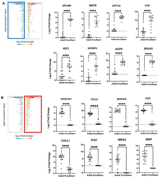 Gene expression comparison of 13 eEPC lines and 15 adult EC (AEC) lines, (A) Highly expressing genes expression in eEPC lines compared to adult EC (AEC) lines and (B) Highly expressing genes expression in AEC lines compared to eEPC lines, Volcano Plot was used one-way ANOVA, p (Correlation), cut-off p ≤ 0.05, FC ≤ 2.0. Statistical analysis between two groups (13 eEPC lines vs. 15 AEC lines) was performed using the unpaired student’s t-test with two-tailed p value (**** p < 0.0001).