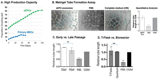 Stable and scalable production of embryonic endothelial progenitor cells (eEPCs), (A) Cumulative population doublings of eEPC line (30MV2-6) was up to 80 population doublings, compared to primary MSCs, which began to senesce and lose proliferative capacity after 8 to 12 population doublings, (B) Angiogenic activity of eEPC (30MV2-6) secreted exosomes in HUVEC vascular network tube forming assay was equivalent to CGM (Complete Growth Medium containing VEGF, FGF, and IGF). Relative tube length = sample total tube length/CGM total tube length, (C) Angiogenic activity measured by HUVEC tube forming assay was retained from early to late passage (30 pd to 50 pd), and (D) Exosomes from eEPC grown in a Quantum cell expansion bioreactor (Terumo BCT) resulted in no loss of angiogenic activity compared to T-flask culture. The negative control is vehicle (PBS) in BM (serum-free basal medium). Error bars indicate the standard deviation from the mean of technical (n = 3) replicates, representative of at least 2 biological repeats. ns represents statistically not significant.