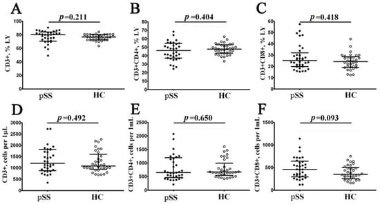 Comparison of relative numbers and concentrations of the main circulating T cell subsets in patients with pSS. The scatter plots (A–C) and (D–F) illustrate the percentages (proportion of T cell subset within the total lymphocyte subset) and absolute numbers (count of cells per 1 μL of total peripheral blood) of T cells (CD3+), T-helper cells (Th, CD3+CD4+) and CD8+ T cells (Tcyt, CD3+CD8+), respectively. Patients with Sjögren’s syndrome are represented by black circles (pSS, n = 34), while white circles denote healthy controls (HC, n = 34). Each data point corresponds to an individual subject, and horizontal bars depict the group medians and interquartile ranges (median (Q25; Q75)). Statistical analysis was performed using the Mann–Whitney U test.