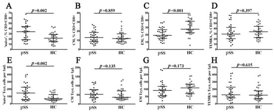 Alteration in relative and absolute numbers of peripheral blood maturation CD8+ T cell subsets in patients with pSS. Scatter plots (A–D) and (E–H) show the percentages and absolute numbers of ‘naïve’ (CD45RA+CD62L+), central memory (CM, CD45RA−CD62L+), effector memory (EM, CD45RA−CD62L−) and terminally differentiated CD45RA-positive effector memory (TEMRA, CD45RA+CD62L−) CD8+ T cells, respectively. Black circles denote patients with Sjögren’s syndrome (pSS, n = 34); white circles denote healthy control (HC, n = 34). Each dot represents individual subjects, and horizontal bars depict the group medians and quartile ranges (med (Q25; Q75)). The statistical analysis was performed with the Mann–Whitney U test.
