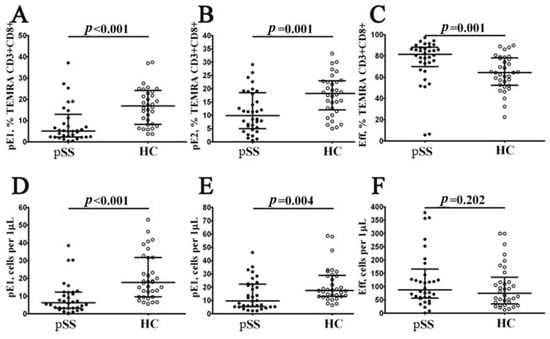 Alterations in relative and absolute number of TEMRA CD8+ T cell subsets with different patterns of CD27 and CD28 expression in patients with pSS. Scatter plots (A–C) and (D–F): TEMRA CD8+ T cells were subdivided into CD27+CD28+ pE1, CD27+CD28− pE2 and CD27−CD28− E subsets, respectively. The scatter plots in (A–C) illustrate the relative proportions of pE1, pE2 and effector cells within the TEMRA CD8+ T cell subset. Meanwhile, the scatter plots in (D–F) represent the concentrations of pE1, pE2 and effector cells (measured as the number of cells per 1 μL of peripheral whole blood). In these plots, patients with pSS are represented by black circles (n = 34), and healthy controls are depicted by white circles (n = 34). Each data point corresponds to an individual subject, while the horizontal bars show the medians and interquartile ranges (med (Q25; Q75)) for each group. The statistical analysis was performed using the Mann–Whitney U test.