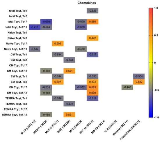 Preliminarily, we analyzed possible correlations between IP-10 (CXCL10), MCP-1 (CCL2), MCP-3 (CCL7), MDC (CCL22), MIG (CXCL9), MIP-1a (CCL3), MIP-1b (CCL4), IL-8 (CXCL8), eotaxin (CCL11), fractalkine (CX3CL1) and main ‘polarized’ CD8+ T cell subsets (Figure 6). We noticed that serum levels of two CXCR3 ligands—CXCRL9 and CXCRL10—negatively correlated with total Tc17.1 and ‘naïve’ Tc17.1 frequencies. Similarly, the negative correlations were detected between total and effector memory Tc17, as well as total, central memory, effector memory and TEMRA Tc17.1 cells and serum levels of CCL2, which acts during physiological immune defense and chronic inflammation to activate the migration of myeloid and lymphoid cells [24]. Next, the frequencies of circulating Tc1 CD8+ T cell subsets of different maturation states negatively correlated with serum levels of CCL7 andCCL3, which play an important part in inflammatory events by attracting macrophages and monocytes to further amplify inflammatory processes [25], and in regulating lymph node homing of dendritic cell subsets as well as inducing antigen-specific CD4+ and CD8+ T cell responses [26]. Furthermore, CCL3 serum levels positively correlated with the increased frequencies of circulating ‘naïve’ Tc2 cells, as well as effector memory Tc2, Tc17 and Tc17.1 CD8+ T cell subsets, which were unregulated in patients with pSS, as shown previously.
