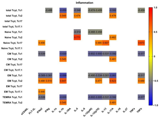 Next, we analyzed possible correlations between main proinflammatory and effector cytokines and ‘polarized’ CD8+ T cell subsets in patients with pSS (Figure 7). Interestingly, we found no significant correlations between serum levels of main proinflammatory cytokines—IL-1a, IL-6, IL-18 and TNFα—and ‘polarized’ CD8+ T cell subsets in patients with pSS. However, we noticed positive correlations between IL-1b and several Tc2 subsets (including total Tc2 cells and CM, EM and TEMRA Tc2 cells); conversely, we found negative correlations between IL-1b levels and Tc1 subset frequencies, including total Tc1 cells and CM, EM and TEMRA Tc1 cells. Similarly, ‘non naïve’ Tc1 CD8+ T cells negatively correlated with such cytokines as IL-12p70, IL-13 andIL-17A serum levels, which regulate type 2 and type 3 inflammation [27].