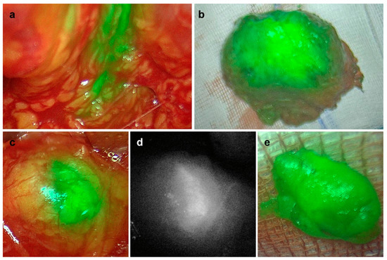 In vivo (a,c,d) and ex vivo (b,e) detection of fluorescence in the prostate (a,b) and in one lymph node (c–e) of patient #4. (a–c,e) Overlay; (d) monochromatic.