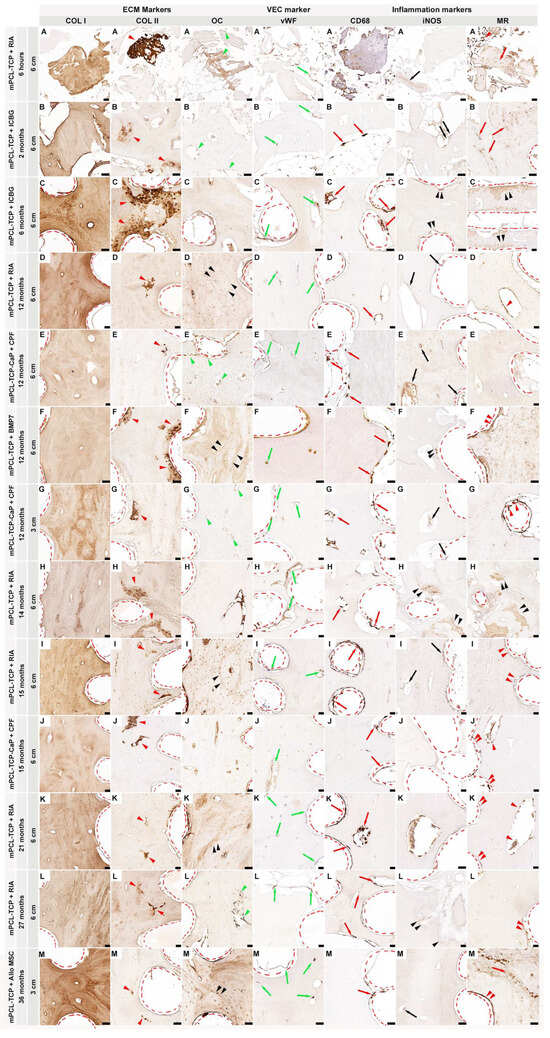 Immunohistochemical analysis of protein expression in SGBR throughout the entire bone regeneration period. Foreign-implanted materials, including mPCL scaffolds, activate an inflammatory response composed of a milieu of multiple converging cytokinetic and immunological events. This includes the provision of a collagen extracellular matrix (ECM) depicted through collagen type I (COL I, A–M) deposition, which is observed in all sample groups and during all time points. Clear differences in COL I stain intensity can be seen in woven bone (stronger) and lamellar bone (lighter). As bone formation in large bone defects is accomplished through osteochondral bone formation, it is common to observe the presence of a few remnant areas of mineralized cartilage going through resorption, as depicted by COL II deposition near the mPCL scaffold struts, as well as at the interface of host and new bone (COL II, A–M, red arrowheads). Concomitantly, the up-regulation of osteocalcin (OC) is observed at osteoblast precursors within the vascular mesenchymal tissue of the cutting cones of the remodeling bone tissue (green arrowheads) throughout all time points; however, with some distinct expression at the later time points, which appears to be more prominent at the cement lines of the new secondary osteons formed (black arrowheads) and at osteocyte cells (OC, A–M). As regeneration progresses, neovascularization also continues to re-establish the new vascular network, which is observed by the presence of more mature and elongated vessels through vWF+ expression throughout all time points and all experimental samples; however, this expression decreases around the outer surface of the mPCL-TCP scaffold towards the late time points (vWF, A–M, green arrows). As part of the innate immune system, early physiological wound healing is triggered by cytokines and cellular mediators, including macrophages. Cluster of differentiation 68 (CD68), as a M1 and M2 macrophage subset, was constantly positively stained around the interconnected porous architecture of the mPCL-TCP scaffold (CD68, A–M, red arrows). The pro-inflammatory inducible nitric oxide (iNOS–M1) synthesis observed in our studies appears to be evolving overtime, yet its expression was found to be located at the remnant areas of mineralized cartilage preceding blood vessel invasion at the early time points, and exclusively prevalent at blood vessels at the later time points (iNOS, A–M, black arrowheads and black arrows, respectively). Ultimately, M2 macrophages, depicted by the mannose receptor (MR) marker, appear to self-enhance their recruitment and play a crucial role within the host material’s consolidation and degradation, as observed throughout the expression and positive stain, particularly at the remnants of mineralized cartilage (MR, A–M, double black arrowheads), fragments of the bone graft (MR, A–M, red arrows), osteoblast precursors within the vascular mesenchymal tissue of the cutting cones (MR, A–M, red arrowheads), and at the outer surface of the mPCL-TCP scaffold struts (MR, A–M, double red arrowheads). This initial endogenous regenerative cascade, with further emerging evidence suggesting that the scaffold architecture is a niche where adaptative immune cells are decoding scaffold features, takes influence on the biocompatibility of materials, and appears to further orchestrate phenotypic macrophagic polarization by the presence of the CaP coating. Collagen type I (Col I); collagen type II (Coll II); osteocalcin (OC); cluster of differentiation 68 (CD68); inducible nitric oxidase synthesis (iNOS); and mannose receptor (MR). Red dashed lines: scaffold struts. Scale bars: 50 µm.