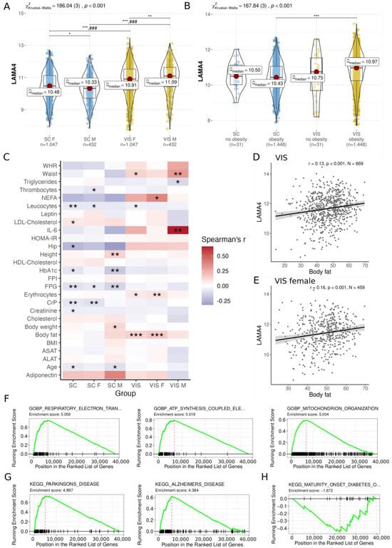 Analysis of LAMA4 gene expression and correlation within the cross-sectional cohort. LAMA4 expression comparison in SC and VIS AT of (A) male (M) and female (F); (B) individuals without obesity and obesity. Kruskal–Wallis one-way ANOVA and Dunn’s test for pairwise comparisons was conducted, which was corrected for multiple comparisons using the Hommel method. (C) LAMA gene expression correlation in SC and VIS AT of male and female individuals reveals several relationships with clinical parameters (unadjusted p-values). After p-value adjustment, LAMA4 gene expression correlation remains significant with body fat in (D) VIS and (E) female VIS AT. Gene set enrichment analysis (GSEA, using the Gene Ontology database for biological processes) of the co-expressed genes with LAMA4 in VIS AT reveals enrichment for pathways related to (F) metabolism and energy expenditure, (G) neurodegenerative diseases, and (H) a significant underrepresentation of the pathway for maturity onset diabetes. Significance levels are indicated as * < 0.05, ** < 0.01, *** < 0.001. ### comparisons are significant in all groups of the other tissue (p < 0.001). ALAT: Alanine transaminase; ASAT: Aspartate transaminase; AT: adipose tissue; BMI: body mass index; CrP: C-reactive protein; F: female; FPG: fasting plasma glucose; FPI: fasting plasma insulin; HbA1C: hemoglobin A1c; HDL: High density lipoprotein; HOMA-IR: Homeostatic Model Assessment for Insulin Resistance; IL-6: interleukin 6; M: male; NEFA: nonesterified fatty acids; SC: subcutaneous; WHR: Waist hip ratio; VIS: visceral.