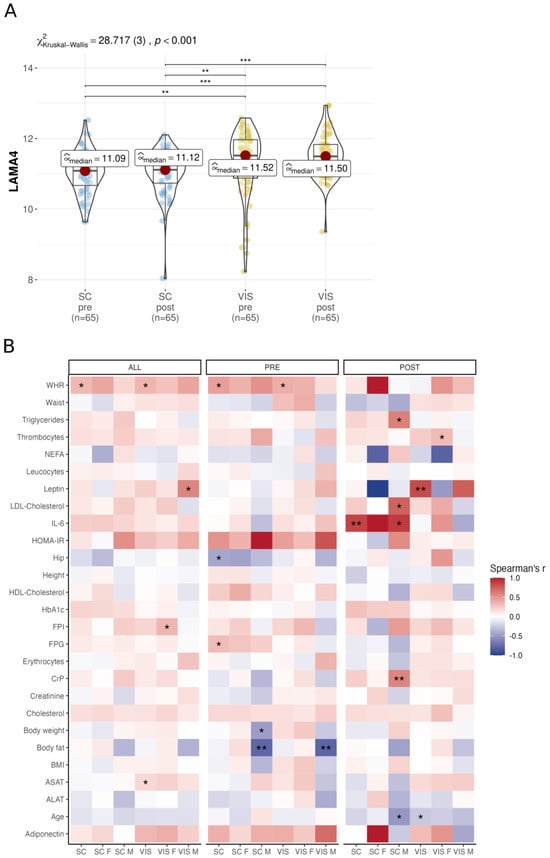 Analysis of LAMA4 gene expression and correlation within the bariatric surgery cohort. (A) Comparison of LAMA4 expression pre- and post-surgery in SC AT and VIS AT, analyzed with Kruskal–Wallis one-way ANOVA and Dunn’s test for pairwise comparisons, corrected for multiple comparisons using the Hommel method. (B) Correlation analysis with Spearman correlation coefficient pre- and post-surgery and in both timepoints separated by gender and tissue (unadjusted p-values). Significance levels are indicated as * < 0.05, ** < 0.01, *** < 0.001 respectively.