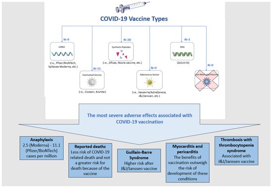 Different types of vaccines against the SARS-CoV-2 virus were developed to prevent the subsequent COVID-19. Vaccines can be divided into the following categories based on the platform used for their development: DNA, mRNA, inactivated, live attenuated, virion-like particle, viral vector, recombinant subunit and synthetic peptide (Figure 1). The figure presents the most severe conditions reported as adverse events following vaccination, with 50 already approved COVID-19 vaccines as of the end of 2022 [9].