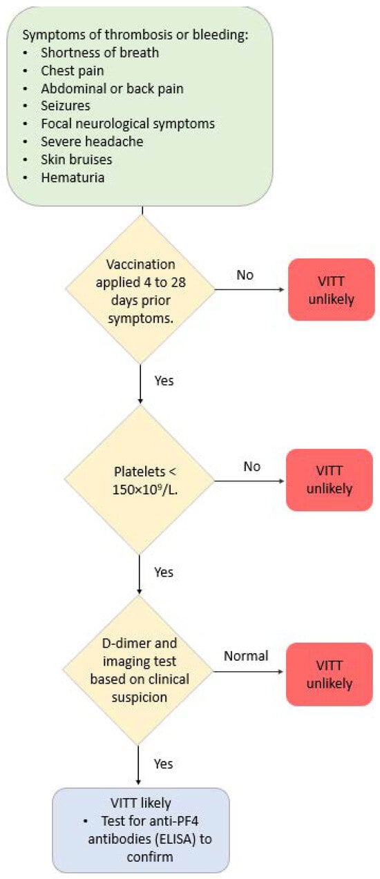 Different terms are used to refer to these conditions/complications after COVID-19 vaccination, which are predominantly localized in the venous vasculature system—vaccine-induced thrombotic thrombocytopenia (VITT), vaccine-induced pro-thrombotic immune thrombocytopenia (VIPIT), vaccine-induced immune thrombotic thrombocytopenia (VIITT) and thrombosis with thrombocytopenia syndrome (TTS) [80]. Antibodies that recognize PF4 (platelet-associated factor 4) cause these thrombotic events. The antibodies are IgG that activate platelets through specific receptors on the platelet surface. These events develop between 4 and 42 days after receiving a COVID-19 vaccine [81,82]. Figure 2 illustrates a suggested diagnostic algorithm in patients with suspected VITT.