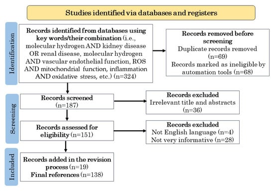 To investigate the therapeutic potential of H2 for DKD, we conducted a comprehensive literature search focusing on the etiology of DKD and current treatment methods and its efficacy, the relationship between oxidative stress and inflammation, ROS production and elimination, the relationship between ROS and pathogenesis, mitochondrial function, the involvement of ROS in renal disease, the effects of H2 on animal models of renal disease and human patients, and the effects of H2 on vascular endothelial function. From April 1991 to September 2023, we utilized electronic databases from PubMed and Google Scholar for our research. In our PubMed search, we employed Medical Subject Headings (MeSH) terms. Our search strategy involved the use of Boolean operators AND, OR, and NOT to combine keywords. The PRISMA flowchart in Figure 1 describes the methodology for already published information selection, using the directions given by Page et al. [,].