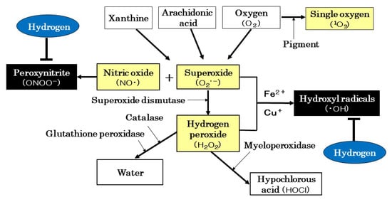 The human body is equipped with antioxidant enzymes, such as SOD, CAT, and GPX, as described above, as a defense mechanism to suppress the formation of ROS. However, the function of antioxidant enzymes and the body’s defense capabilities against ROS decline with age [,]. Furthermore, when ROS are produced in large amounts due to mental and physical stress, excessive exercise, smoking, and exposure to ultraviolet light and irradiation, the balance between ROS production and scavenging systems is disrupted, and ROS that exceed the protective capacity of antioxidant enzymes appear [,]. The disruption of the balance between oxidation and anti-oxidation results in superoxide and hydrogen peroxide catalyzed by iron and copper ions producing ·OH, which has a very potent oxidative capacity []. ·OH is also generated in other biological reactions and when water, a biological substance, is exposed to irradiation. ·OH is present in the body for only one millionth of a second; however, during that time, it exhibits an oxidizing power 100-fold stronger than that of superoxide []. On the other hand, nitric oxide (NO·) reacts with superoxide to produce ONOO−, which is extremely oxidizing [,]. When ·OH and ONOO− are produced, they react with nucleic acids, lipids, and proteins in biological membranes and tissues, causing oxidative damage and even oxidizing DNA. Antioxidant enzymes cannot scavenge ·OH and ONOO−, while H2 selectively reduces ·OH and ONOO−, converting them to water (Figure 2) [,,,].