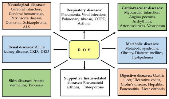 ROS play a significant role in the onset and progression of not only DKD but also a vast array of other diseases. These include neurological diseases such as cerebral infarction, cerebral hemorrhage, Parkinson’s disease, dementia, schizophrenia, and amyotrophic lateral sclerosis, as well as cardiovascular diseases like myocardial infarction, angina pectoris, arrhythmia, arteriosclerosis, and vasospasm [,]. Involvement of ROS is also observed in respiratory diseases such as pneumonia, viral infections, pulmonary fibrosis, chronic obstructive pulmonary disease, and asthma, renal diseases such as acute kidney disease, CKD, and DKD, and digestive diseases such as gastric ulcer, ulcerative colitis, Crohn’s disease, hepatitis, pancreatitis, and liver cirrhosis []. Furthermore, ROS involvement is also observed in metabolic diseases such as metabolic syndrome, obesity, diabetes mellites, and dyslipidemia, skin diseases such as atopic dermatitis and psoriasis, and supportive tissue-related diseases such as rheumatoid arthritis and osteoporosis [,]. Therefore, it would not be an overstatement to say that ROS are implicated in diseases affecting most organs and tissues throughout the human body (Figure 3).