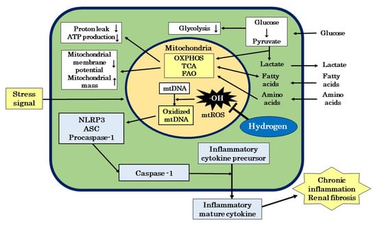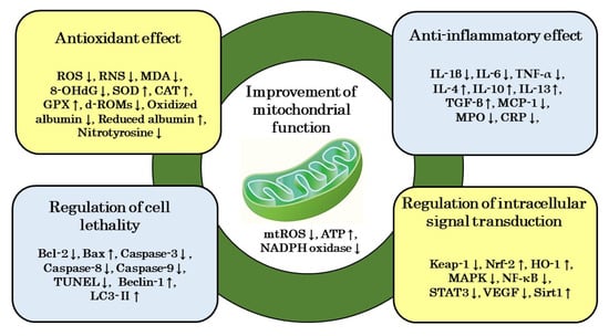 Li et al. investigated the efficacy of HRW in a rat model of iron nitrilotriacetate-induced renal injury []. HRW decreased Cr, BUN, MDA, ONOO− production, and NADPH oxidase activity and increased CAT activity. HRW ameliorated mitochondrial dysfunction and oxidative stress, including kidney mitochondrial swelling, decreased ATP production, and increased mtROS production []. HRW also suppressed inflammation as indicated by the decreased expression of nuclear factor-κB (NF-κB), IL-6, and monocyte chemotactic protein-1 (MCP-1) in the kidney []. Furthermore, HRW suppressed vascular endothelial growth factor (VEGF) expression and signal transducer and activator of transcription 3 (STAT3) phosphorylation, thereby reducing the incidence of renal cell carcinoma and inhibiting tumor growth [].