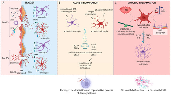 Representative diagram of the molecular mechanism underlying neuroinflammation. (A) Trigger phase: following the pathogen entry through the disrupted Blood–Brain Barrier (BBB), the recognition of damage-associated molecular patterns (DAMPs) and pathogen-associated molecular patterns (PAMPs) by pattern recognition receptors (PRRs) on the astrocytes and microglia surface occurs. (B) Acute neuroinflammation: regulated activation of glial cells. Activated astrocytes are involved in the stabilization of the BBB integrity. Additionally, they release both pro-inflammatory and anti-inflammatory cytokines in a balanced manner. Pro-inflammatory cytokines allow the recruitment of infiltrating immune system cells, while anti-inflammatory ones help maintain a regulated inflammatory state. Simultaneously, microglia activate their macrophagic and antigen-presenting functions. They also contribute, along with astrocytes, to the release of pro-inflammatory cytokines. These events lead to pathogen neutralization and activation of tissue repair mechanisms. Once their task is completed, anti-inflammatory cytokines released by astrocytes act to maintain a regulated physiological inflammatory state. (C) Chronic neuroinflammation: persistent and unregulated inflammatory state characterized by hyperactivation of glial cells (gliosis). Factors such as enhanced differentiation of the pro-inflammatory phenotype (M1), production of reactive oxygen species (ROS), and alteration of the balance of excitatory and inhibitory neurotransmitters by microglia contribute to neuronal dysfunction and the consequent neurodegenerative state.