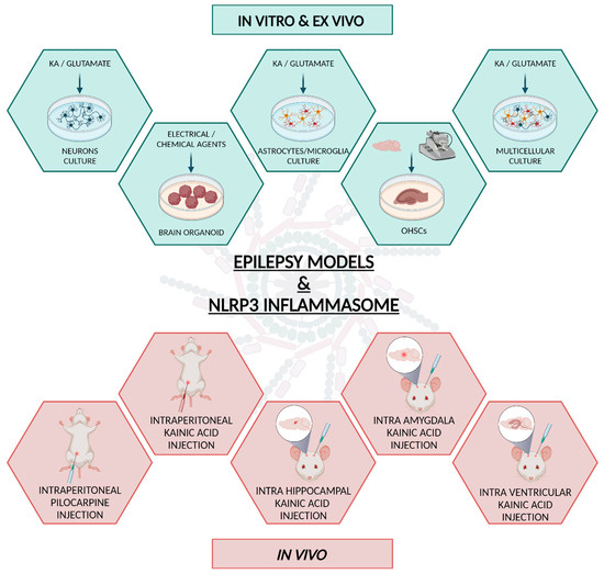 It is known that epileptogenesis is associated with severe and chronic neuroinflammation, accompanied by neuronal damage and gliosis [167]. All these molecular and cellular events work in a loop in which seizures induce inflammation and inflammation, that, in turn, exacerbates seizures, contributing to the progression of the disease. The role of NLRP3 in epilepsy has been investigated in vivo preclinical studies using various animal models (Figure 3). Indeed, compared to in vitro models, the use of animal models offers the advantage of better modeling of a complex disease such as epilepsy, thus offering the possibility of better studying the pathogenetic mechanisms underlying the disease. In the specific case of epilepsy, the in vivo model allows for the evaluation of parameters such as comorbidity and seizure occurrence and also identifies potential mechanisms of epileptogenesis. However, the creation of such a complex model can be more challenging due to the greater number of parameters that need to be considered. In this regard, the choice of certain substances over others, as well as the different methods of administration, can affect both the success of the experimental model and the outcome of the analysis.
