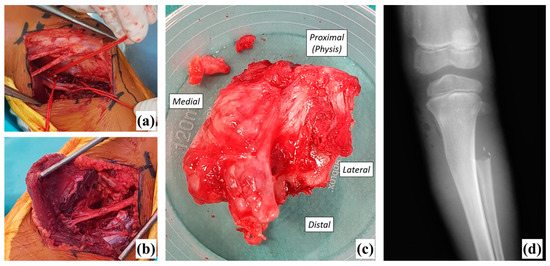 Intra-operative views ((a): medial approach with vessels identified; (b): lateral approach after resection with common fibular nerve identified and (c): resected exostosis with the proximal fibular metaphysis) and postoperative radiograph (d).