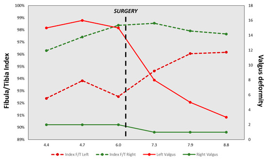 As for follow-up, the patient was evaluated every six weeks during the first three months and every six months until the first two years after surgery. The patient presented a gradual improvement of the valgus deformity. At 27 months postoperative, he was asymptomatic with a full range of motion of the knee, no clinical deformity and no knee frontal laxity. Long-leg radiographs showed the complete correction of the tibia valga (HKA: 178° AND MAD < 5 mm) (Figure 2, Table 1). Notably, due to extraperiosteal resection, there was no sign of bone union at the proximal fibula. Tibial bowing improved as well (Figure 4). Lateral release of the fibula led to an increase in the fibula/tibia index (from 93% preop to 96% at follow-up), resulting in valgus deformity improvement (Figure 5, Table 1). Using a Pearson correlation test, we found that HKA and fibula/tibia index were strongly correlated (R = 0.9390, p < 0.001).