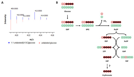Labeling of metabolites by 13C-glucose in cancer cells. (A) Labeling of erythronate by [U-13C6]glucose in cancer cells. A549 lung carcinoma cells were cultured with media containing either unlabeled glucose (red) or a 1:1 mixture of unlabeled and [U-13C6]glucose (blue). Intracellular polar metabolites were extracted from the cells and analyzed on GC-MS. The ion 409, which is one of the characteristic fragments of TMS-erythronate and contains all four carbon atoms of the molecule, is found to be M + 4 labeled (m/z = 413), indicating that all four carbon atoms of erythronate are derived from glucose. (B) Carbon transition map for [1,2-13C2]glucose through the pentose phosphate pathway. This map illustrates the fate of 13C-atoms (indicated by circles) derived from [1,2-13C2]glucose, which is used to trace the metabolism of glucose via the pentose phosphate pathway (PPP) and glycolysis. The first 13C-atom of [1,2-13C2]glucose is lost through decarboxylation if G6P enters the oxidative branch of the PPP but is retained if G6P is metabolized via glycolysis. Detailed chemical structures are shown in Figure S2. G6P, glucose-6-phosphate; 6PG, 6-phosphogluconate; Ru5P, ribulose-5-phosphate; R5P, ribose-5-phosphate; Xu5P, xylylose-5-phosphate; F6P, fructose-6-phosphate; S7P, sedoheptulose-7-phosphate; GAP, glyceraldehyde-3-phosphate; E4P, erythrose-4-phosphate; CO2, carbon dioxide. This figure is adapted and reprinted with permission from Dong et al., 2020 [20]. Copyright 2020 American Chemical Society.