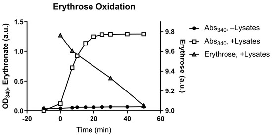 Conversion of erythrose to erythronate by A549 cell lysate. A549 cell lysates were used in an enzymatic assay that converts erythrose to erythronate in the presence of NAD+. The conversion was indicated by the formation of NADH, which can be monitored by absorption at 340 nm (Abs340). Samples were taken from the assay at various time points to determine the depletion of erythrose and the formation of erythronate.
