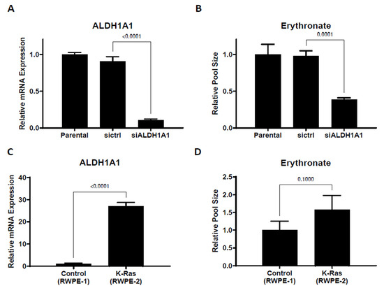High aldehyde dehydrogenase activity has been considered a marker of cancer stem cells [24,25], and ALDH1A1 has been suggested as a target for immunological therapeutics of many types of cancer [26]. To further investigate the correlation between ALDH1A1 expression and erythronate level, we used two prostate epithelial cell lines, RWPE-1, which is non-tumorigenic, and RWPE-2, a KRAS-transformed version of RWPE-1 that is capable of forming tumors in nude mice [27]. ALDH1A1 expression level in RWPE-2 cells was found to be 26-fold higher than that in RWPE-1 cells, and we observed 60% higher levels of intracellular erythronate in RWPE-2 cells compared to RWPE-1 cells (Figure 3C,D). The correlation between ALDH1A1 overexpression and higher erythronate level in the tumorigenic RWPE-2 cell line compared to the non-cancerous RWPE-1 cell line also suggests that high ALDH1A1 activity or erythronate concentration may have a role in cell tumorigenicity. This is consistent with several previous studies that suggest increased activity of ALDH1A1 is associated with tumorigenicity [28,29].