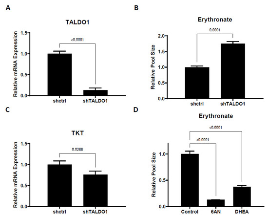 We have demonstrated that erythronate can be enzymatically derived from the PPP intermediate E4P, which suggests that erythronate levels can potentially reflect PPP activity. To test this, we manipulated the non-oxidative branch of the PPP, which consists of a series of biochemical transformations catalyzed by transketolase (encoded by genes TKT, TKTL1, and TKTL2 in humans) and transaldolase (encoded by the gene TALDO1 in humans). It has been reported that the erythronate level in the urine and plasma of transaldolase-deficient patients [31] is significantly higher than those in unaffected individuals [18]. We, therefore, performed shRNA-mediated silencing of the TALDO1 gene and found that a 7-fold reduction of its mRNA expression led to an approximately 75% higher erythronate level (Figure 4A,B). The levels of several other PPP intermediates, including E4P and upper glycolytic metabolites, were also significantly elevated (Table S1) in the TALDO1 knockdown cells, with a slight decrease in the transketolase expression (Figure 4C).