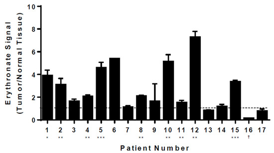 Levels of erythronate in tumor and normal tissues from lung cancer patients. Metabolites were extracted from tissue samples taken from 17 lung cancer patients. GC-MS analysis revealed that, despite various basal levels in healthy tissues from these patients, erythronate (quantified at m/z 292) was significantly increased in tumor tissues as compared to the surrounding normal tissues in 12 of 17 patients. Stars indicate the significance of measurements between tumor and healthy tissues for the same patient. * p-value < 0.05; ** p-value < 0.01, *** p-value < 0.001 (Welch’s t-test). † indicates p-value < 0.05 for a decrease in erythronate in tumor tissue relative to normal tissue. Error bars, s.d. (n = 3).