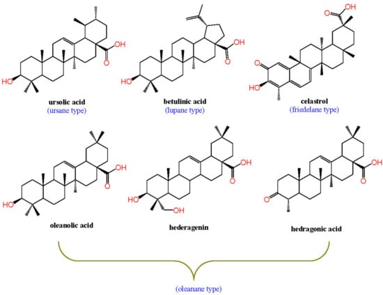 - Salvador, J.A.R.; Leal, A.S.; Valdeira, A.S.; Gonçalves, B.M.F.; Alho, D.P.S.; Figueiredo, S.A.C.; Silvestre, S.M.; Mendes, V.I.S. Oleanane-, ursane-, and quinone methide friedelane-type triterpenoid derivatives: Recent advances in cancer treatment. Eur. J. Med. Chem. 2017, 142, 95–130. [Google Scholar] [CrossRef] [PubMed]