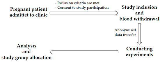 Patient recruitment took place over a period of 2 years (Figure 1). The following inclusion criteria were applied to the control group: existing pregnancy (at least 25 weeks of pregnancy), age of at least 18, voluntary written consent, and no presence of PE or HELLP syndrome. The following conditions were applied to the PE or HELLP group: existing pregnancy (at least 25 weeks of pregnancy), age of at least 18, voluntary written consent, and occurrence of PE or HELLP syndrome. The exclusion criteria for all three study groups were an age under 18, patient refusal, withdrawal of consent, known anemia, or emergency indication for caesarean section. Because this was an ex vivo study with no diagnostic implications and not an intervention study, there were no discontinuation criteria.